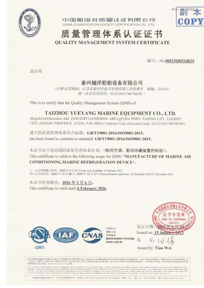 泰州越洋船舶設備有限公司多年專業從事艦船用空調、冷藏、冷凍設備、冷庫系統,通風安裝系統(空調通風,機艙通風,自然通風)等。本公司地處美麗的曲霞鎮工業園區,固定資產1200萬人民幣,占地面積1.5萬平方米左右,公司產品廣泛用于海軍驅逐艦護衛艦,補給艦,海警,醫療船,科考船等,如:“東方紅2“,“海大號”,“向陽紅06”,“向陽紅09”,“向陽紅03”,“大洋1號”,“東方紅3”,“向陽紅18”,“向陽紅52”,地質級科考船“業冶錚”號海洋平臺。